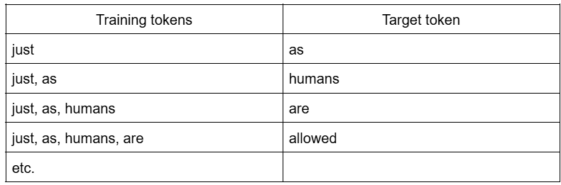The words on the left are given to the model as input, the model makes a prediction and if it does not predict the target word, its weights are updated a little bit so that next time it is more likely that the model makes the correct prediction. It is quite obvious that if the model learns to predict the next word based on the previous words as it is presented in the table it will result in an awful model that always predicts “as” after the word “just” - it is far from what we expect from creative writing. This is where vast amounts of text come into play. When a model is fed an awful many sequences starting with “just, as”, it will at some point learn that there are many nouns that may come afterwards. Which noun (or any other part of speech) it will output depends on the probabilities of all next tokens given all previous tokens, randomness chosen by the user, etc. This way LLMs learn not only what words to use in which situations, but also how to put them together into a grammatically correct way (although probably it is more of a conceptual difference, in LLMs everything must be related to relative token probabilities and grammatically correct words should just be tokens with probabilities higher than grammatically incorrect words).